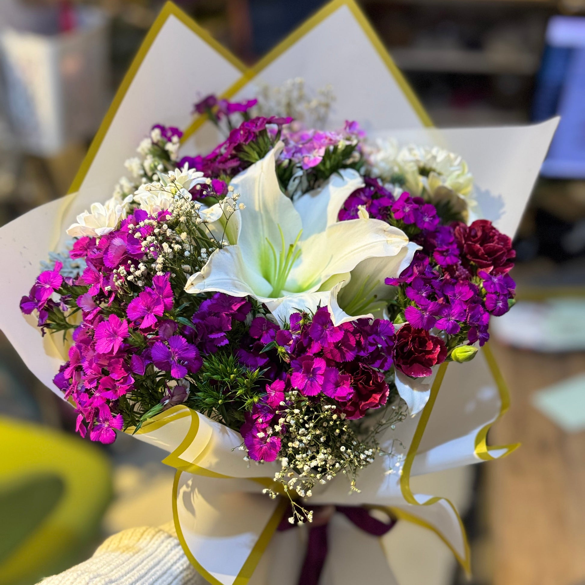 Beyaz Bukette Beyaz Lilyum ve Renkli Hüsnüyusuflar
